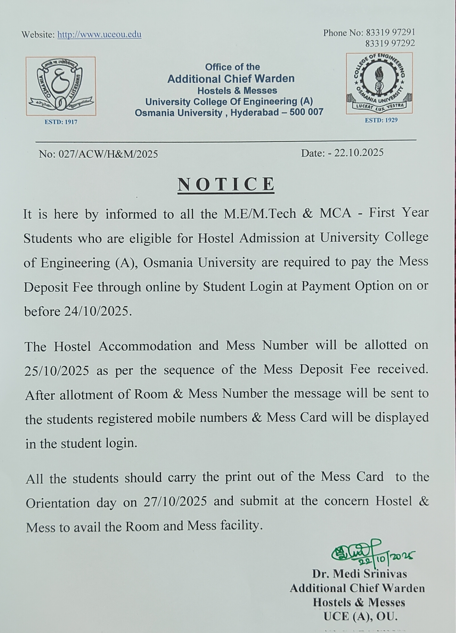 Notice for Payment of Mess Deposit Fee